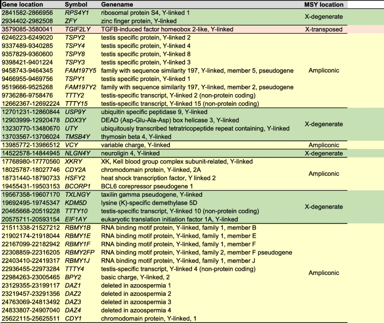 Table 1 List of male specific Y-chromosomal (MSY) genes analyzed in this study. Gene annotation (Symbol), full genename, and gene location in the MSY region (X-degenerate, X-transposed, or ampliconic, highlighted in green, red and yellow, respectively) are represented